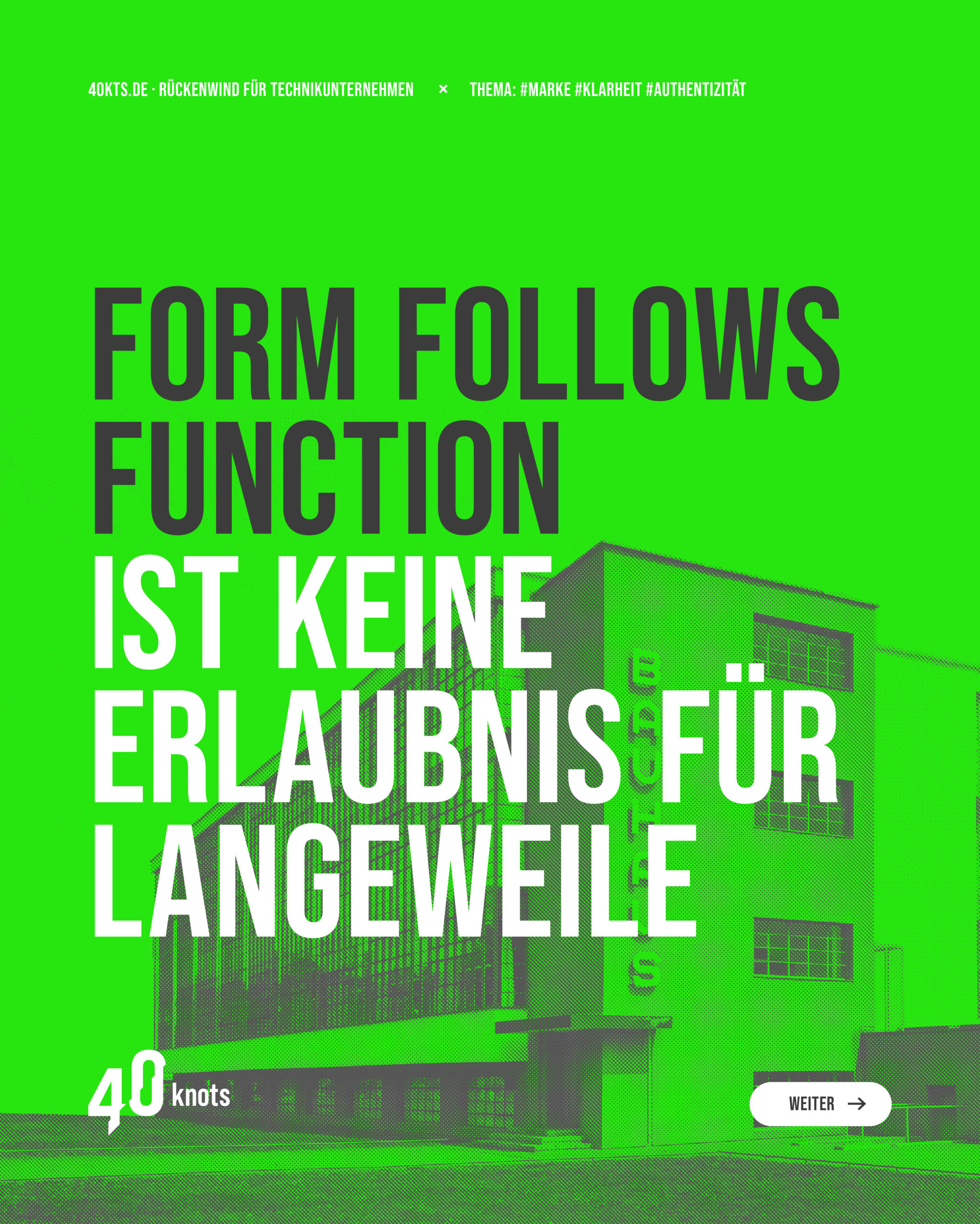 Im Gegenteil: Die individuelle DNA 🧬 eures Unternehmens und das Streben nach Klarheit sollten die entscheidenden Faktoren in eurem Auftritt und eurer Markenkommunikation sein, denn nur dann folgt die Form auch wirklich der Funktion. 🎯